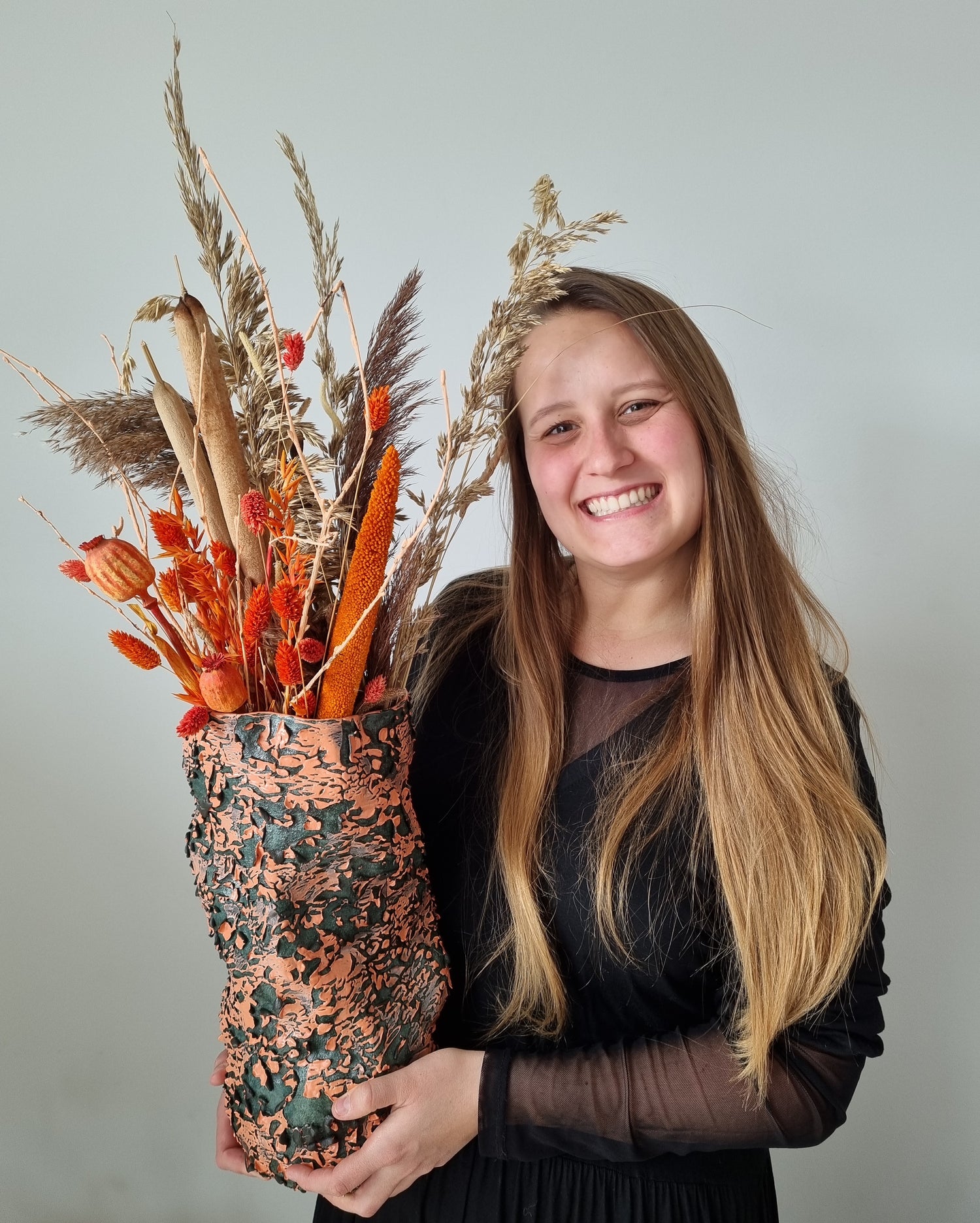 Jeg blev uddannet Keramisk Designer fra det Kongelige Akademi i 2020 og er enormt optaget af lerets bølgende udtryk og glasurens uendelige muligheder.