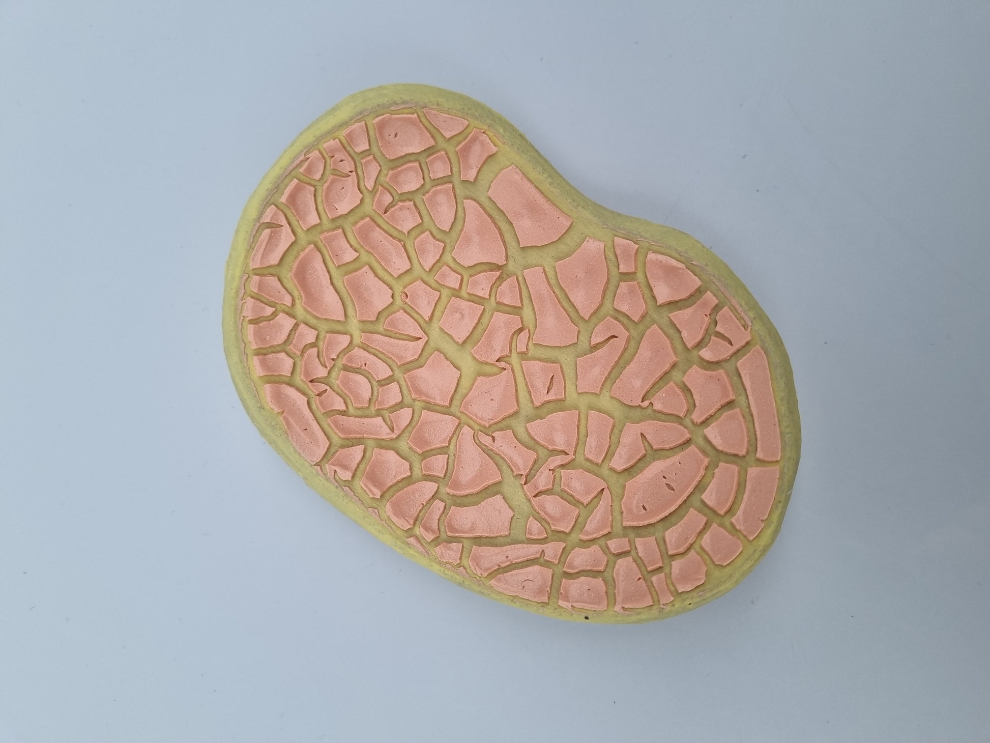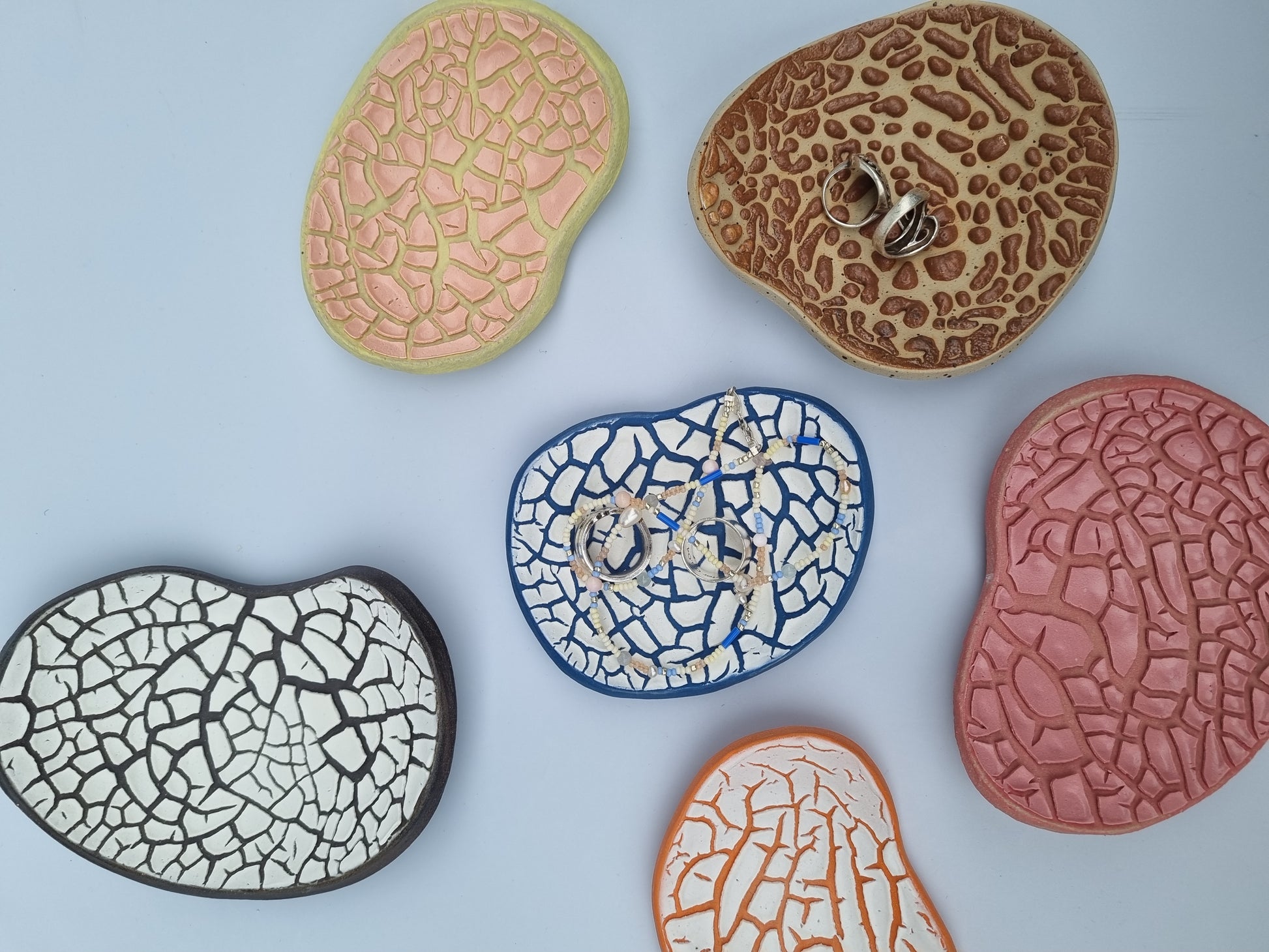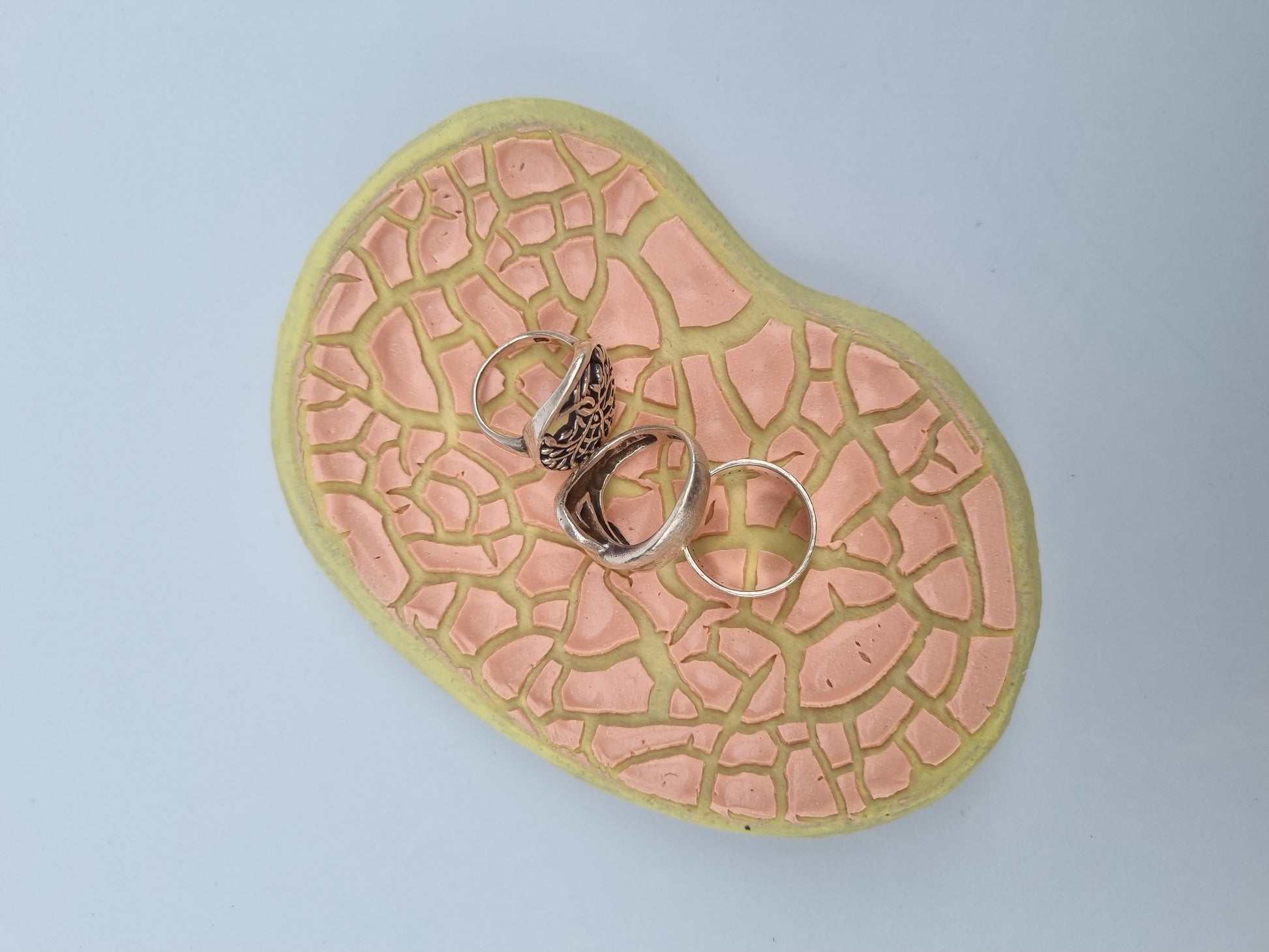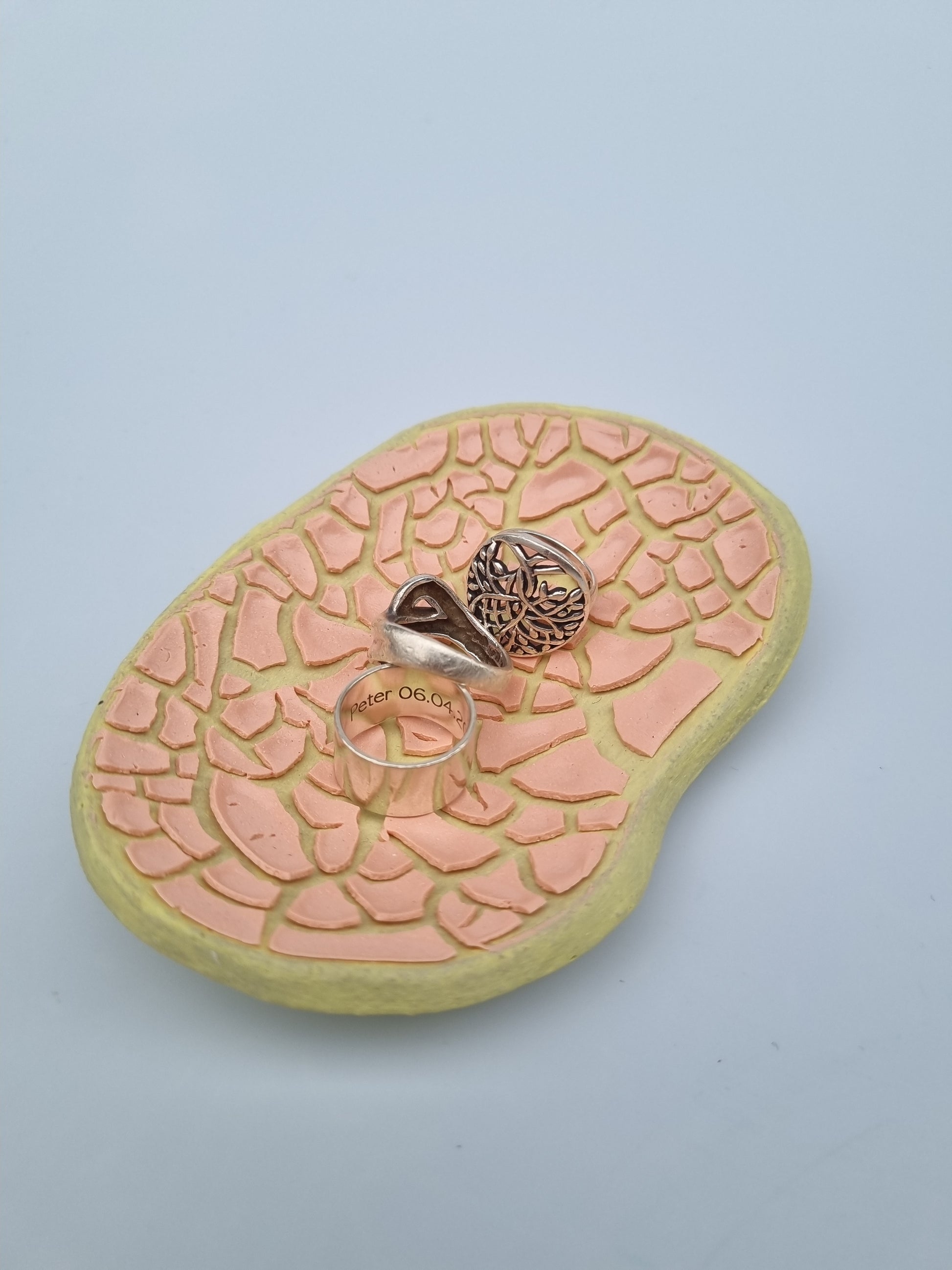 Mini unika skål med en gul baggrund og en ferskenfarvet kravlende glasur.
