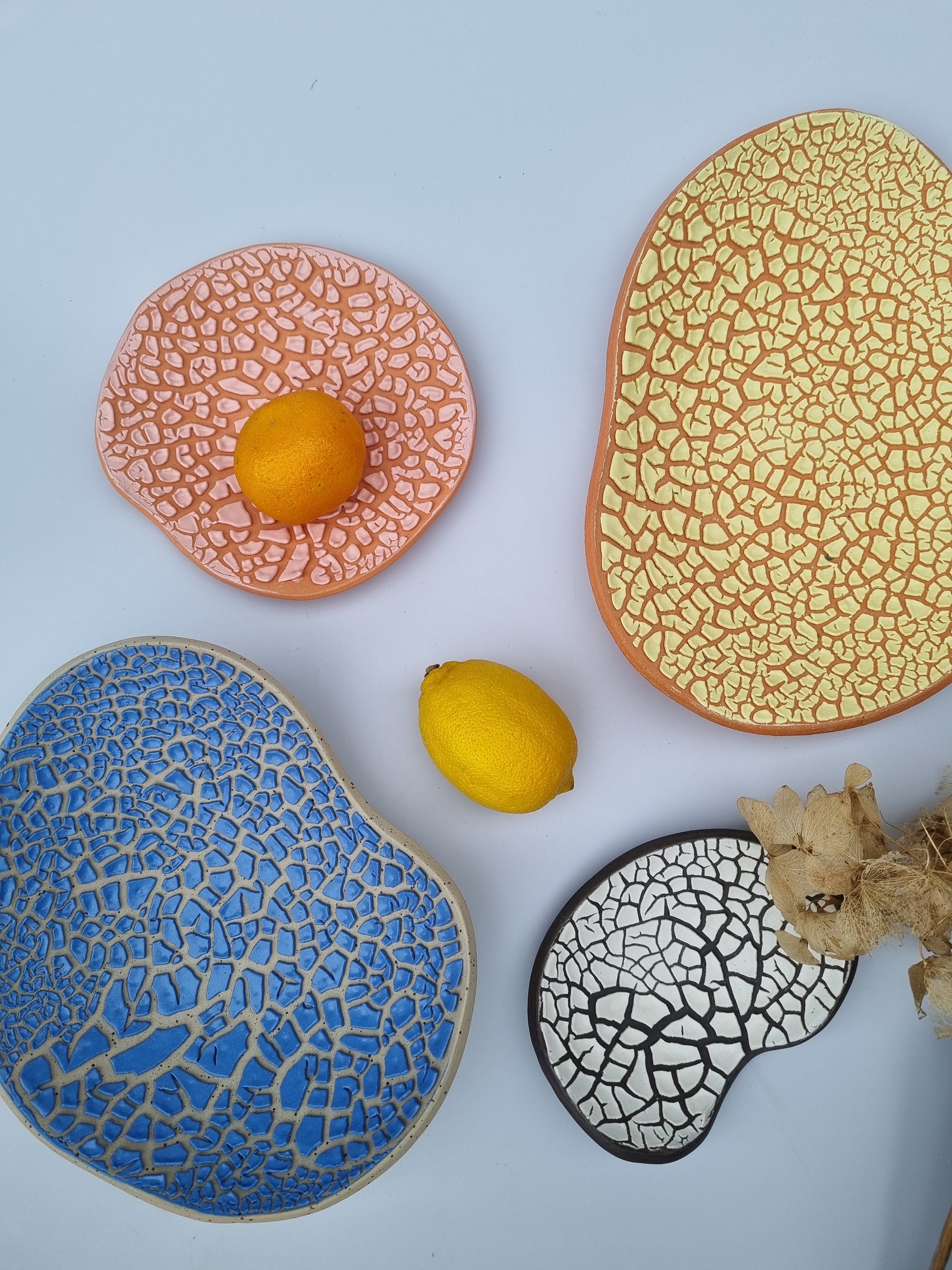 Mellem unika fad med en orange baggrund og en ferskenfarver kravlende glasur.