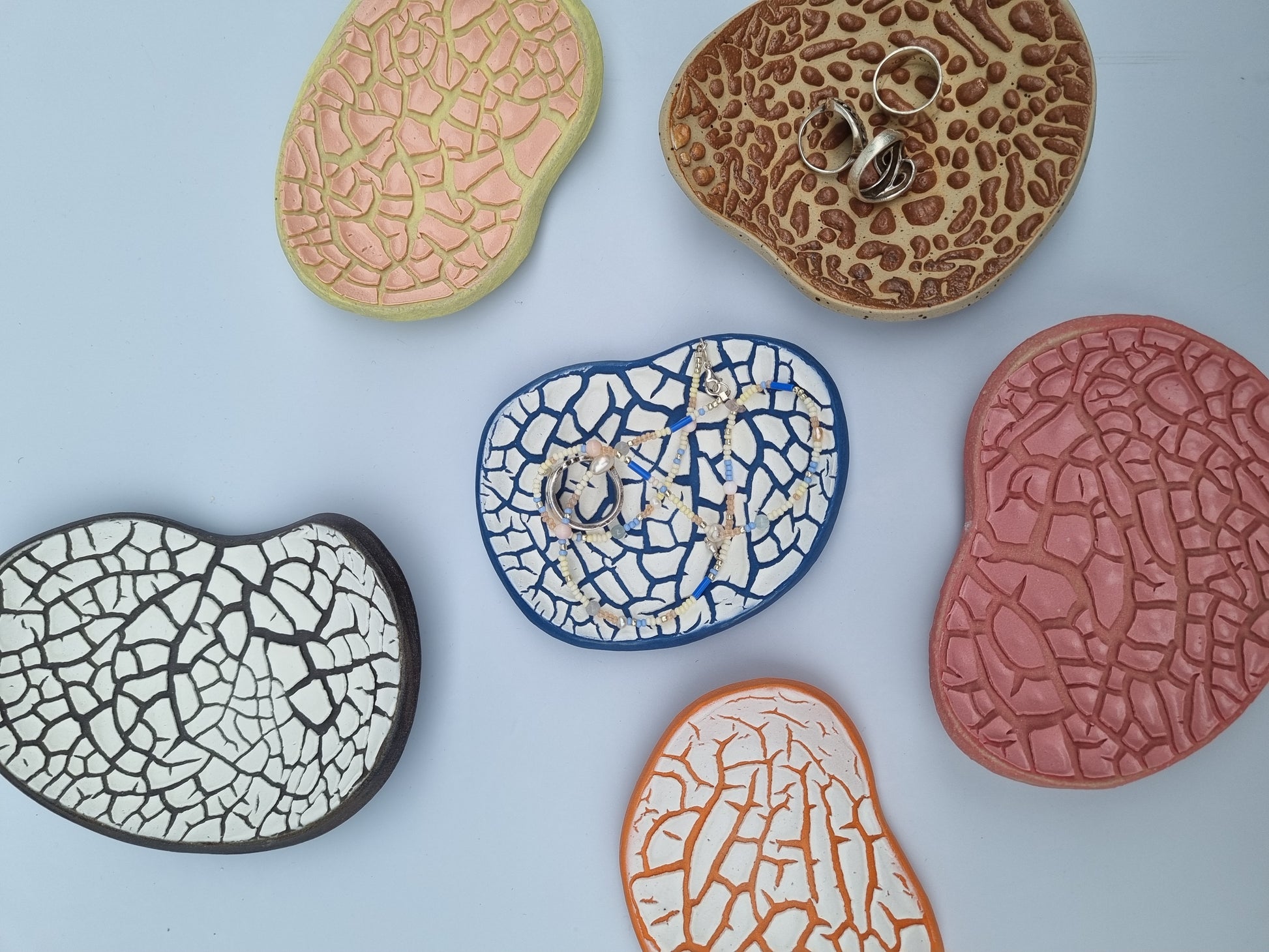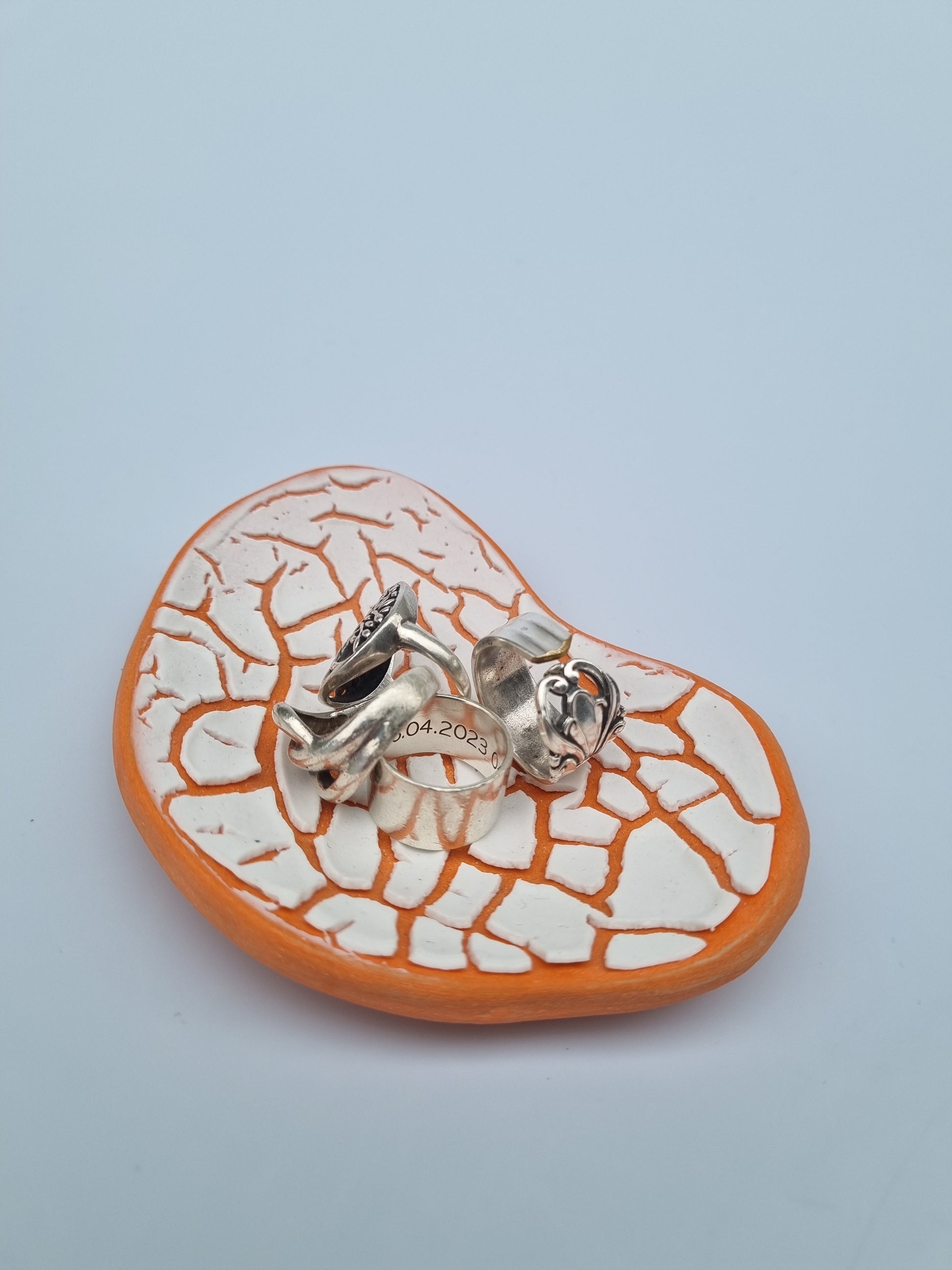 Mini unika skål med en orange baggrund og en hvid kravlende glasur.